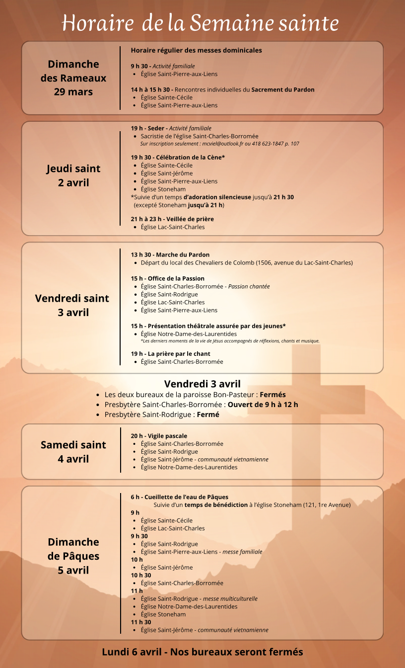 Bienvenue sur notre site web. En le visitant, vous constaterez que nous employons un nouveau langage, celui de l'Unité missionnaire Charlesbourg-Laurentides. En effet, depuis août 2021, notre unité regroupe deux grandes paroisses : Bon-Pasteur (Saint-Pierre-aux-Liens, Notre-Dame-des-Laurentides, Lac-Saint-Charles, Stoneham) et Saint-Charles-Borromée (Saint-Rodrigue, Saint-Jérôme, Saint-Charles-Borromée, Sainte-Cécile).