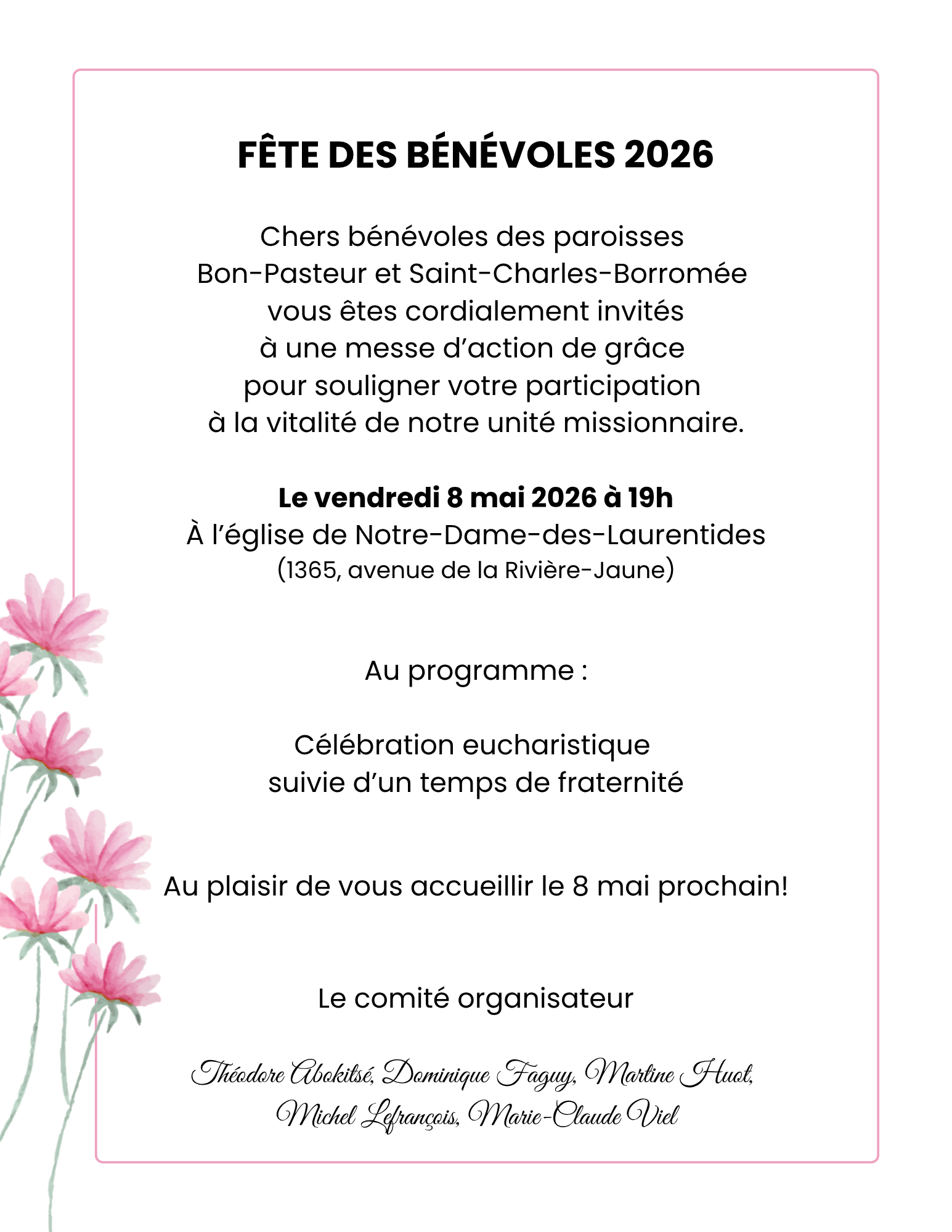 Bienvenue sur notre site web. En le visitant, vous constaterez que nous employons un nouveau langage, celui de l'Unité missionnaire Charlesbourg-Laurentides. En effet, depuis août 2021, notre unité regroupe deux grandes paroisses : Bon-Pasteur (Saint-Pierre-aux-Liens, Notre-Dame-des-Laurentides, Lac-Saint-Charles, Stoneham) et Saint-Charles-Borromée (Saint-Rodrigue, Saint-Jérôme, Saint-Charles-Borromée, Sainte-Cécile).